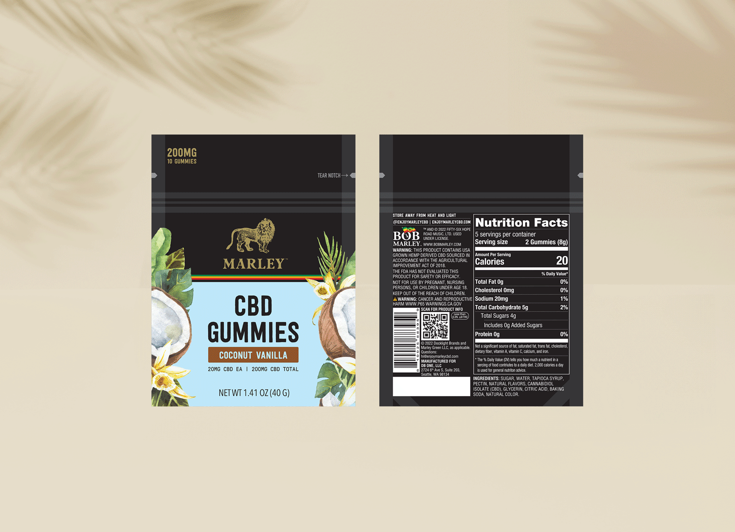 When tasked with designing the packaging for these CBD gummy pouches, my goal was to celebrate the distinct flavor profiles of each product while staying true to Marley's brand identity. It was crucial that this new line seamlessly integrated with their existing products, fostering a unified brand experience. To accomplish this, I opted to frame the pouches with watercolor motifs reminiscent of the tropics, providing customers with a visual preview of the flavors they're about to enjoy. Additionally, I strategically played with colors to ensure easy flavor differentiation, all while maintaining the integrity of the Marley brand standards.